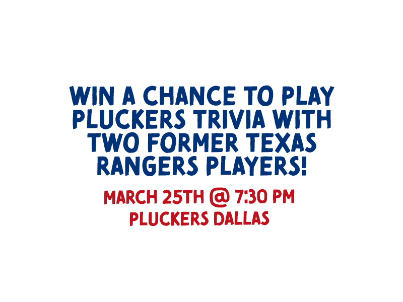 *Three winners and a guest will be randomly selected to be on a Pluckers Trivia team with two former Texas Ranger players. Prize includes one entree, two select pints and one non-alcoholic drink per person.
